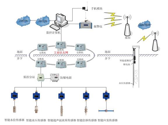 仓水位、钻孔水压、防水设施变形等)的测量,并通过一条公共传输线路将测量数据发送给监测分站,再由监控分站通过工业以太网传至地面监控计算机,实现集中处理、存储、报警。报警信息既被送给井下声光报警器,提醒井下人员采取相应的行动,又通过手机模块以短信形式发送到有关人员的手机上。监控计算机具有网络服务器功能,有关领导和部门只要打开各自的计算机,就可通过浏览网页来查询全部监测内容。各类传感器一般都受环境温度影响,为掌握影响程度,进行温度补偿,所有智能传感器都装有温度传感器。温度传感器还可用于测水温。