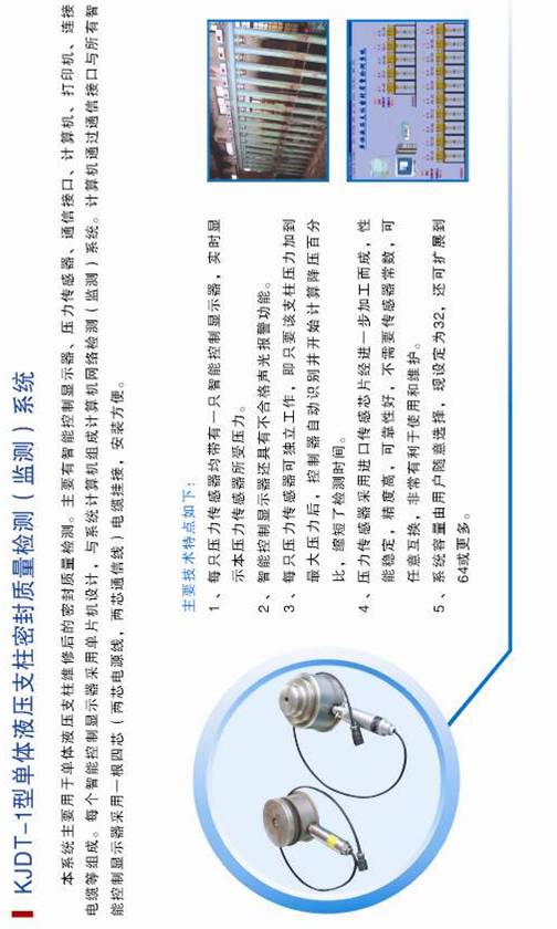 本系统主要用于单体液压支柱维修后的密封质量检测。主要有智能控制显示器、压力传感器、通信接口、计算机、打印机、连接电缆等组成。每个智能控制显示器采用单片机设计,与系统计算机组成计算机网络检测(监测)系统。计算机通过通信接口与所有智能控制显示器采用一根四芯(两芯电源线,两芯通信线)电缆挂接,安装方便。