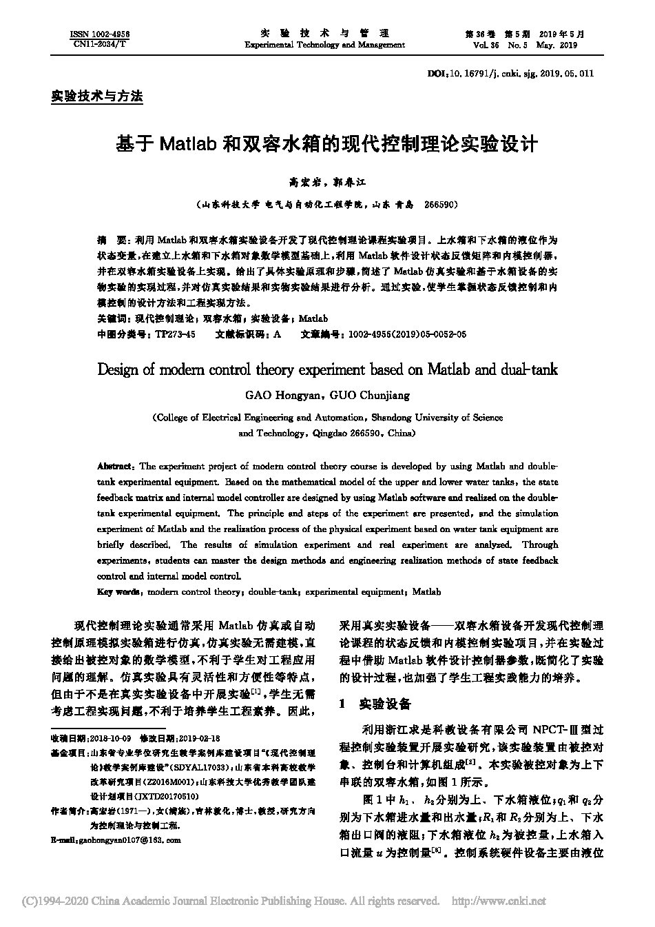 6.论文:基于Matlab和双容水箱的现代控制理论实验设计