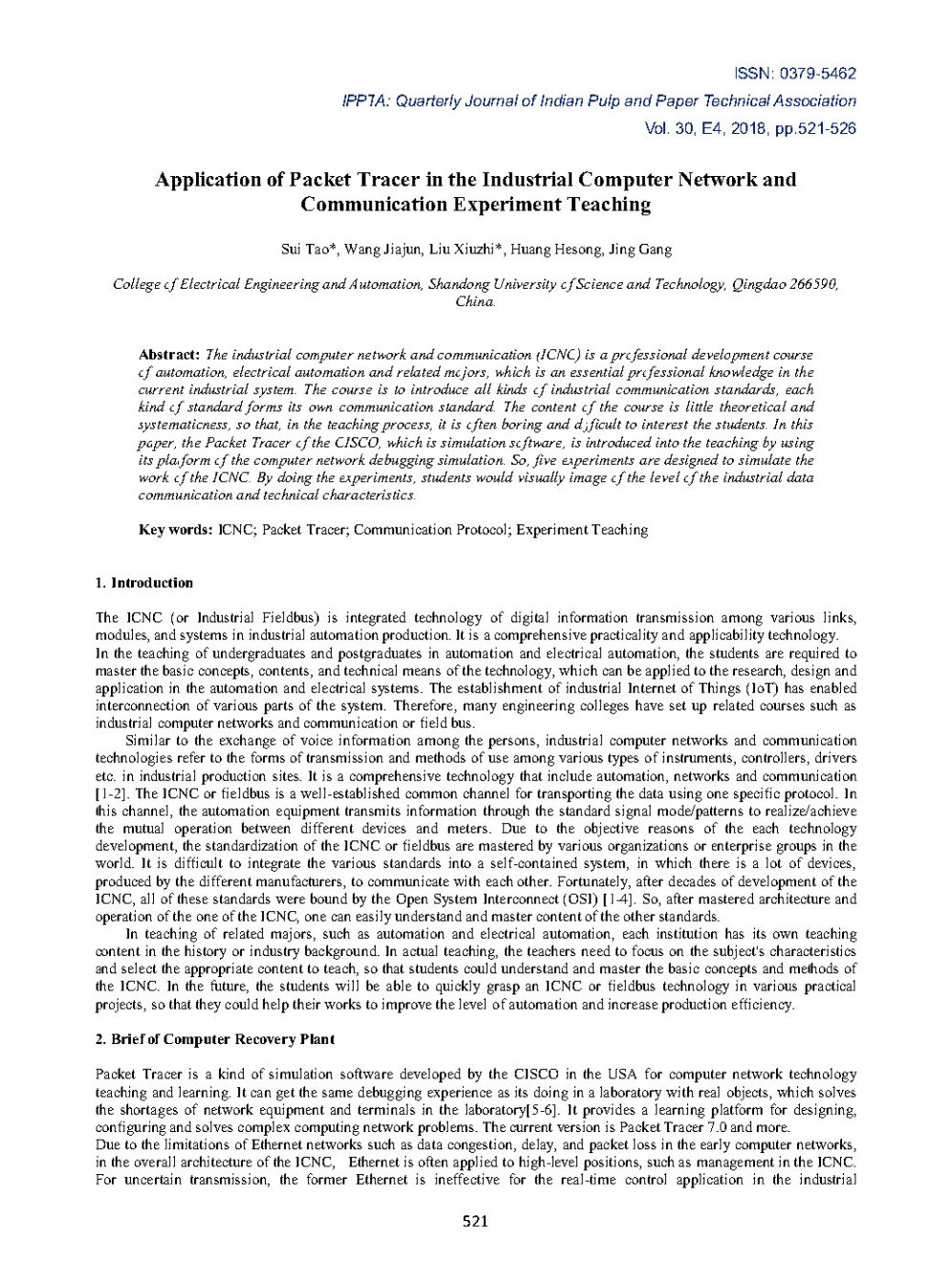 13.论文:Application of packet tracer in the industrial computer network and communication experiment teaching